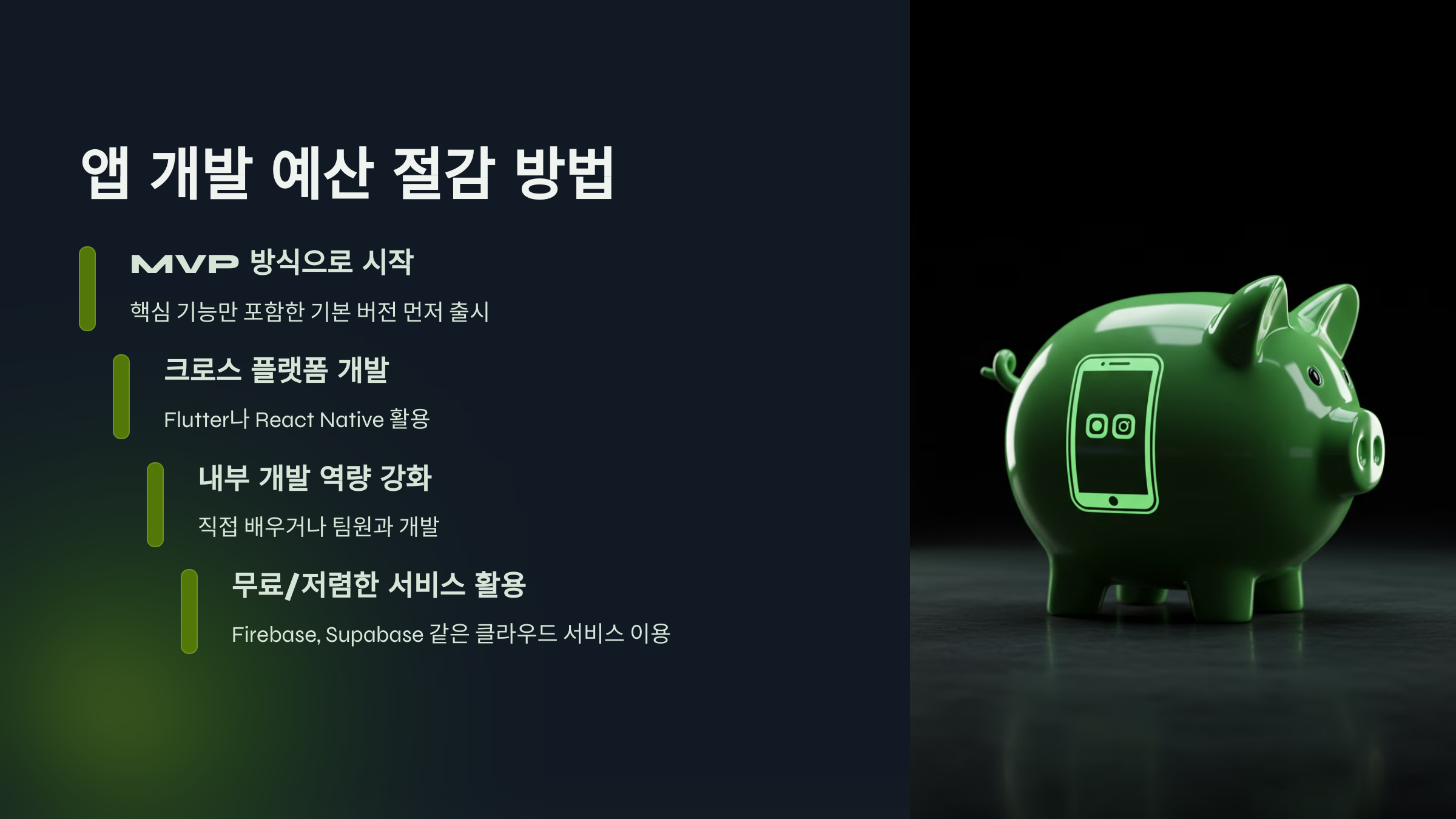 | 개인 개발 | 비용 절감, 일정 조정 가능 | 개발 시간이 길어질 수 있음 | 0~500만 원 |