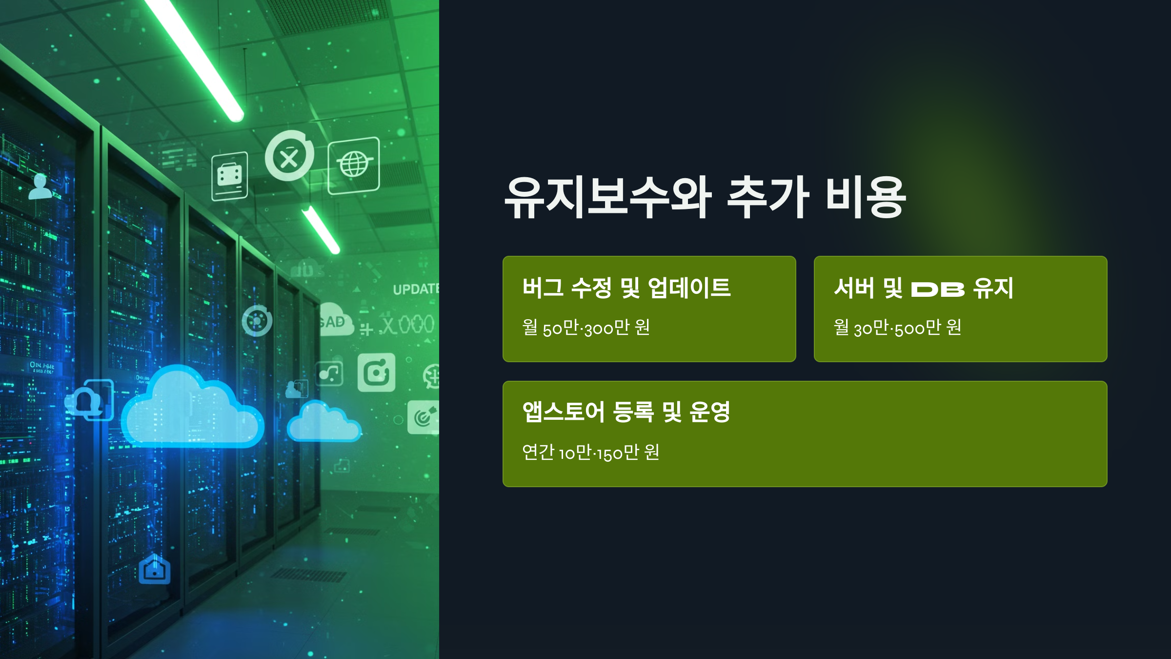- 서버 및 데이터베이스 유지: 월 30만~500만 원
