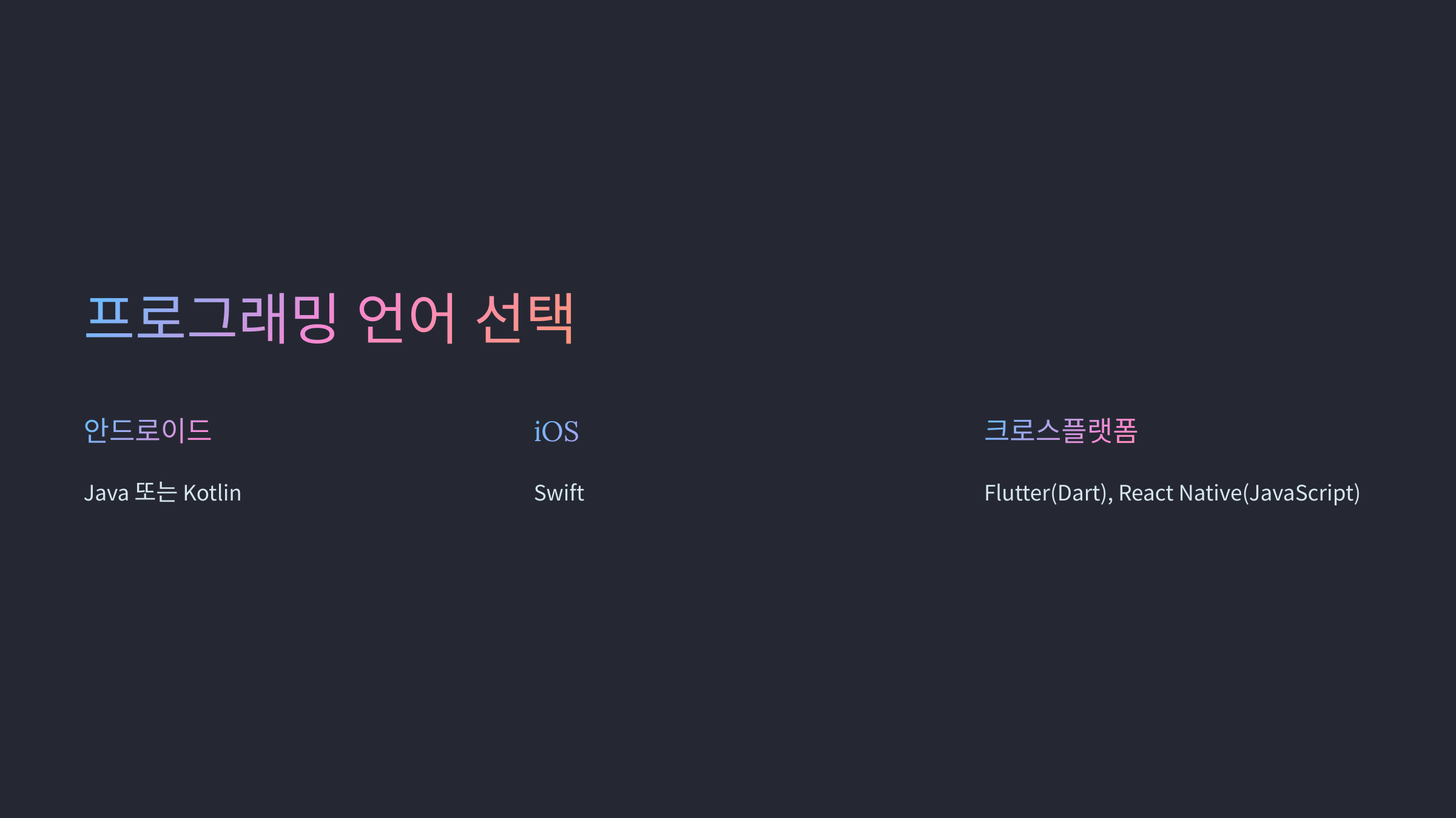 - 크로스플랫폼 앱 → Flutter(Dart), React Native(JavaScript)