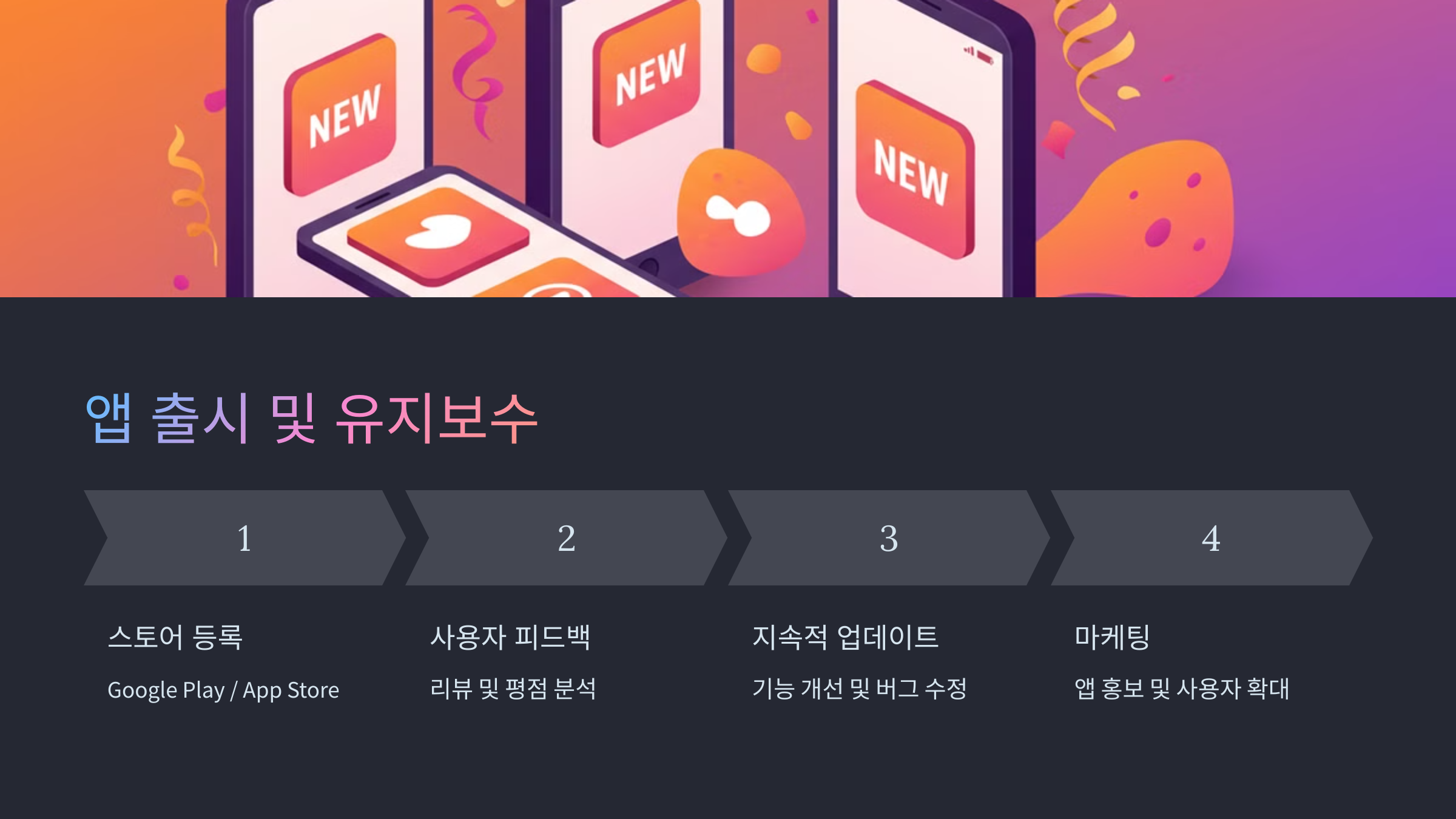 - 앱 출시 및 유지보수 → 스토어에 배포하고 지속적으로 업데이트=