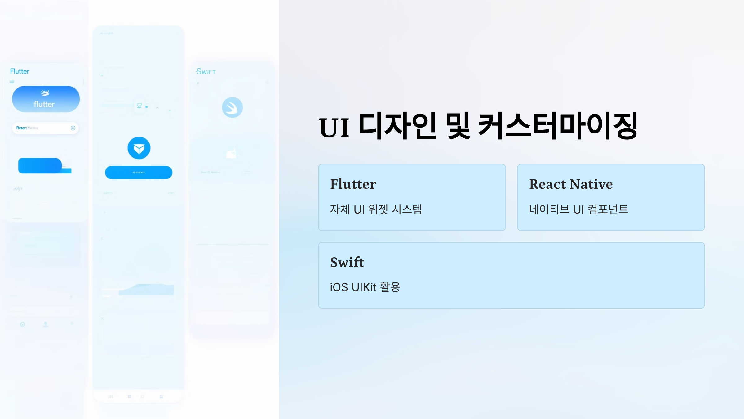 - Flutter → 자체 UI 위젯 시스템 사용 (Material, Cupertino 지원)